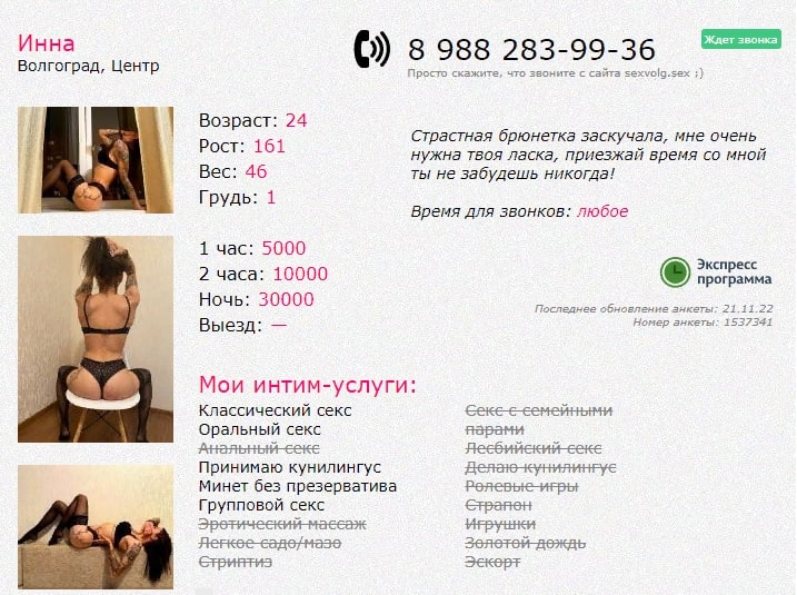 ТТХ соответствует, но возраст показался 20-22. Выглядит молодо и хорошо. Фотографии её. На теле татухи, в лице немного пирсинга. Фигура стройная, подтянутая, на ощупь приятная, не рыхлая. Целуется взасос. Куни доп.