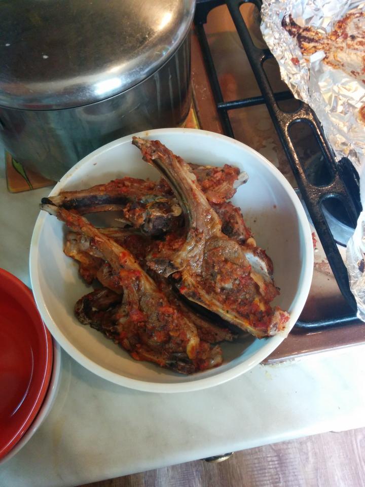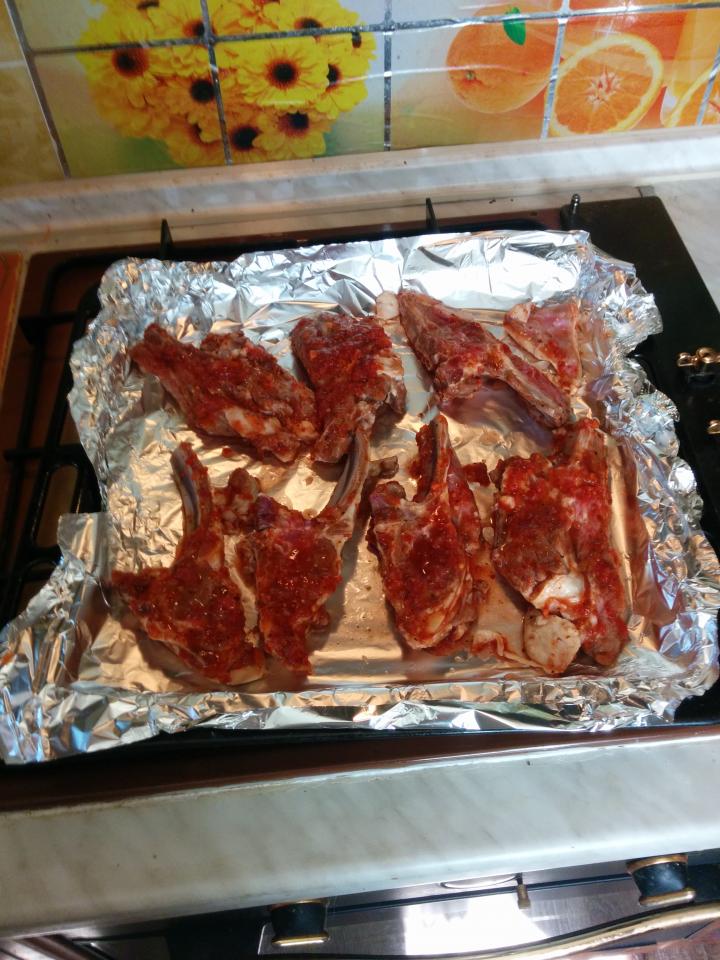 на противень кидаем фольгу, кладём котлетки, обильно поливаем их соусом-маринадом (на фото красное соответственно не кровь, а соус-маринад), накрываем сверху фольгой, делаем 35-45 минут на 200 градусах накрытыми, за 5-8 минут до готовности снимаем верхнюю фольгу, время контролируем исходя из собственных предпочтений уровня прожарки мяса - кто любит сочное полу-сырое тому и 25 минут хватит, кто любит готовое 40 минут оптимальное время...