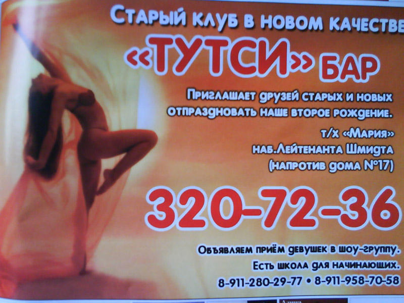 Здраствуйте уважаемые коллеги по отдыху)) Заходил недавно в тутси. Не пришлось побывать ксожалению сразу после ремонта- просто не знал, что клуб открылся. Кстати это достаточно смешно)))В свое время перерыл весь инет, но нигде не нашел мало мальской странички или хотябы паршивенького проспектика с рекламкой мной любимого когда то клуба. И тем не менее,когда проезжал мимо корабля случайно(потому как потерял уже всякую надежду) заметил, что вывеска горит!!! Ура ...зашел. Вход тысяча рублей. Это лояльно. Размен по сто. Впрочем как везде... Эх, старый добрый Тутси!!!Я снова испытал чувство, что меня здесь ждут. На входе меня обыскали полицейские, прощупывая все участки тела, я повторюсь -ВСЕ! Это было очень приятно. Ремонт конечно так себе. Жаль, что из настоящего корабля, который был раньше, получился весьма посредственный интерьер, как и во многих других клубах и барах. Затем я понял, что состав клуба изменился и немного оскуднел, но я не особо расстроился. Те девчонки, которые работают сейчас нисколько не потеряли марки. Танцуют потрясающе, не наглые, как в других клубах, не вымогают , приятно тебе улыбаются и очень вежливы. До сих пор удивляюсь, где таких находят? ПРо фигуры не буду долго распространяться, потому как у каждого человека свой вкус, кто любит по стройнее, кто по аппетитнее. Но отмечу, что все разные и интересные. Когда танцуют просто глазами тебя пожирают, даже заерзал на месте, и очень захотелось пойти в приват( я не любитель верних комнат). Да и ходят не все девушки наверх. Но тут к моему разочарованию я узнал, что приватов НЕт. Тогда я попросил потанцевать у столика более откровенно, но мне сказали, что это невозможно потому как у них нет таких услуг... Мне сказали, что приваты в проекте, что мол скоро будут....(((. Расстроился. А в принципе цены по бару нормальные, можно себе позволить, если с девушками отдыхаешь. А в целом мне понравилось. ПРиду есче!