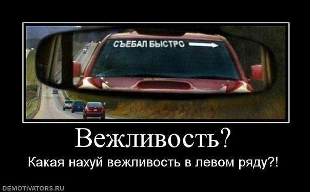 И не говори…Как же заебали, ну чес слово. Уроды, ОСВОБОДИТЕ крайний левый на кольцевой! Не обогнать же пидоров и справа, конечно ко второму ряду нет вопросов, но почему ОНИ (крайний левый) ездиют ТАМ, нах заепали. Вначале мигаю, потом подьезжаю пидору вплотную к заднему бамперу с дальним и жду дырку справа… Не важно что ты (условно,безобид) человек,друг,товарисч, едешь быстрее разрешенной скорости, но если сзади некто едет быстрее,прошу тебя уступи, я те аварийкой мигну. Ежели хочешь слушать музыку или в твоем внедорожнике очень комфортная подвеска, понаслаждайся во втором,в третьем,в крайнем правом, где угодно слушай музыку но только не в крайнем левом!