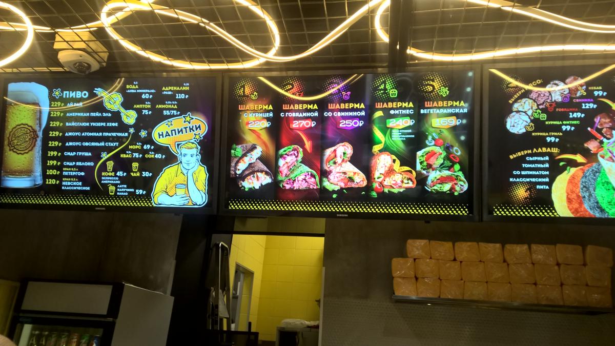 1-й заход вечером, человек пять народу, шаверммастер в поте лица готовит шавермы, кассирша преданно смотрит в глаза.