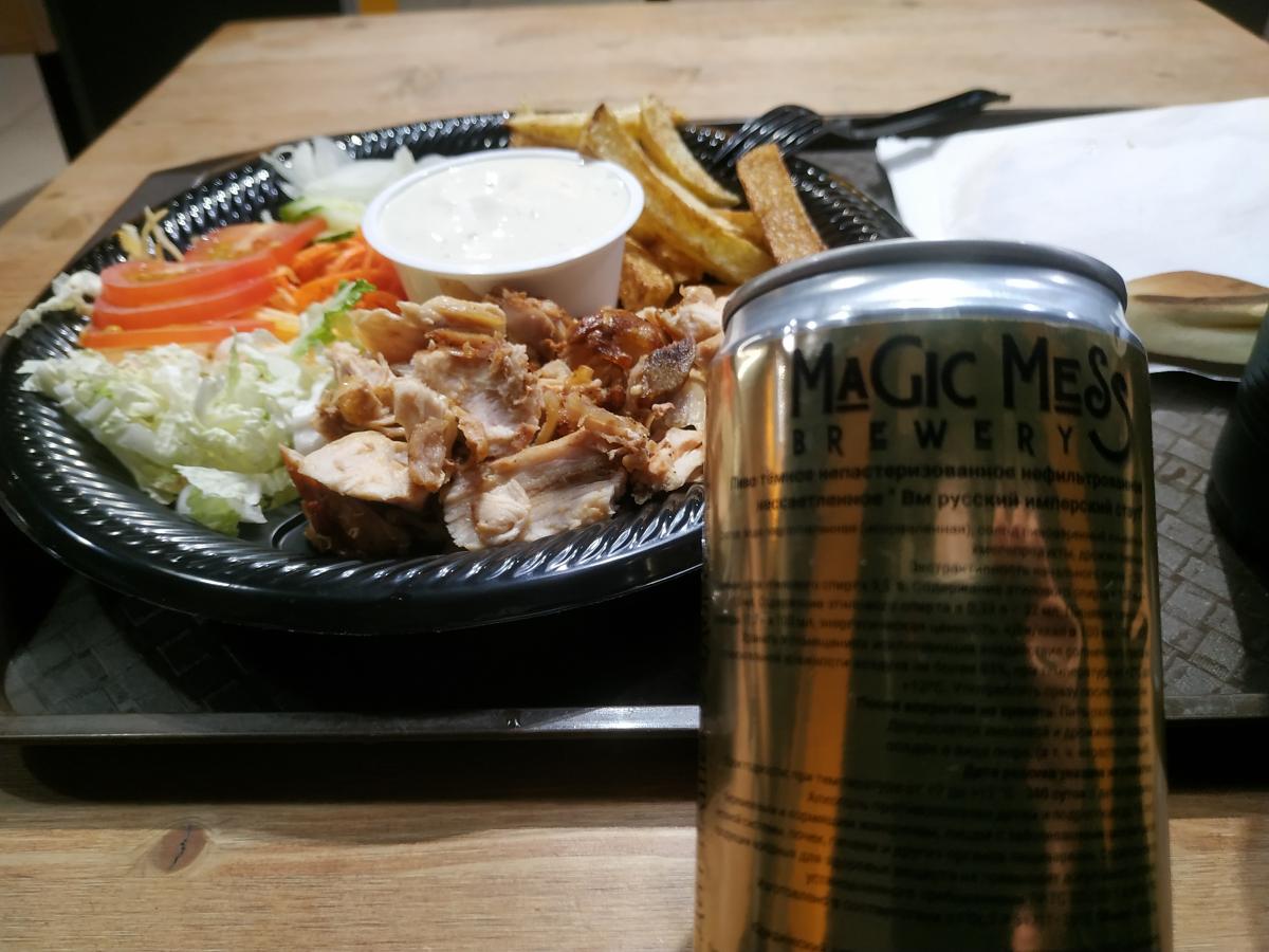 Да вот на днях был. На тарелке зашла. Есть и похуже. Например на той же Торфяной в 13 доме, в шавермочной "Кручу верчу" на тарелке делают хуже. Кура жухлая, и, к тому же тот пухляш шавермье как будто совсем неопытен в шавермочных делах... делает долго, мяса кладёт мало. На тарелке 510гр/349р - и веса меньше и стоит дороже. Пиво опять же там говно. Вспомнить хотяб "Маzай" - ущербная хрень, по 199р у них! Беспредел!