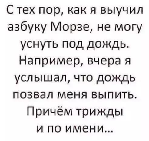 Есть люди, которые несут в себе счастье. Когда эти люди рядом, всё как будто рассветает, становится ярким и красочным. Но моя жена их называет сраными алкашами...