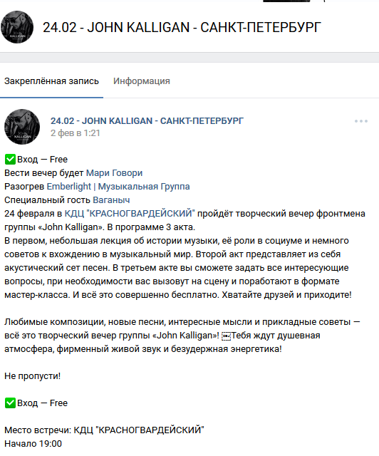 официальная страница концерта - https://vk.com/johnkalligan_sp