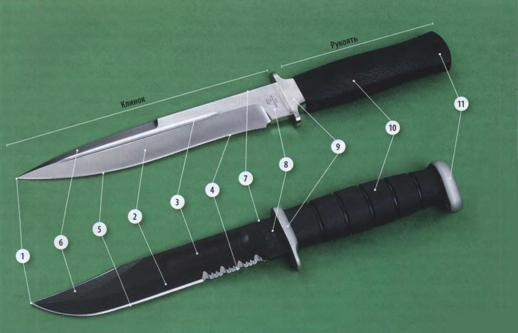 1 Острие клинка; 2 Спуск клинка; 3 Долы; 4 Лезвие; 5 «Брюшко» лезвия, изгиб; 6 Фальшлезвие; 7 Обух клинка; 8 Пятка клинка; 9 Ограничитель; 10 Рукоять; 11 Навершие рукояти.