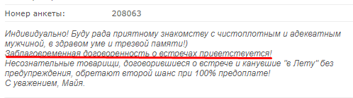 Начало августа, созвон накануне предполагаемой ходки к этой тетке. Четко озвучиваю намерение прибыть на адрес к 16-00 следующего дня на "все включено", то есть заблаговременно, как собственно и заявлено у нее в анкете на рус-досках-суках. Спросила возраст - озвучил свои за 40, а потом пошел прогон, что без частичной предоплаты так заблаговременно не договаривается, но все таки сошлись созвониться в 12 часов на следующий день для подтверждения. Набираю в первом часу дня - уй там, не отвечает. Думаю - ладно, ебется тетя, на хлеб зарабатывает. Перезваниваю через час - то же самое, в трубке мальчик Бананан. Картина стала ясной, забил болт и поехал к молоденькой массажистке на Пионерскую, о чем ни разу не пожалел. С дороги отписал сабжу смской, что не смог дозвониться и поменял планы. Через некоторое время приходит ответ, мол я ждала в 12 ровно, вы не позвонили и я отдала время другому, а потом увидела, что вы таки звонили.