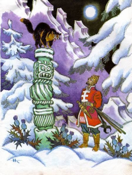 Хотя у Пушкина Кот Ученый ходит вправо-влево, в русской мифологии он ходит вверх-вниз. И не по дереву, а по железному столбу.