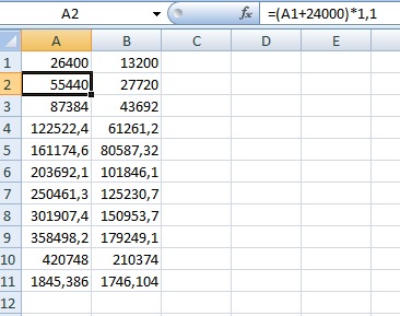 1. Делается ежемесячный взнос 1 тыс. и 1 тыс. добавляет государство. Итого 24000 и 24000*110%=26400. На второй год (26400+24000)*110% = 55440 и т.д. На 10-ый год это будет 420748 руб.