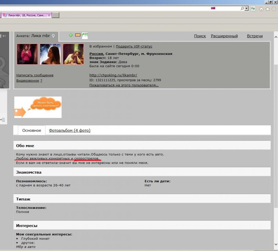 Знаю её еще с начала,так скажем деятельности,как сейчас выяснилось было ей тогда 17,т.е.год назад.Сидела на хуябмах,да и сейчас страница вроде есть mb1248920926,и ещё пару сайтов есть,как а-лин,майлав и прочая дребедень.Практиковала раньше и секс и выезд,была подруга,пару раз приглашал в алекс,девки ржачные,денег так скажем не жалел- приятные в общении и на часы не смотрели.Потом потерялись месяца на 6,удалились отовсюду,вроде личную жизнь пытались настроить