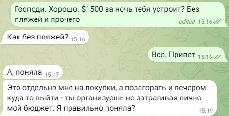 ты хотел свозить меня на бесплатный пляж Ля Мер, хотя в Дубае есть более приличные места как Верде Бич, Никки Бич и тд. Но про финансовый бонус ты как то умолчал за 3 совместных ночи Очень интересно получается, что кому то предлагаешь Атлантис, а мне бесплатные пляжи В очередной раз убеждаюсь, что на этом сайте нельзя вести себя нормально, иначе это воспринимается как слабинка и тебя хотят поиметь как лохушку. Мне еще ни разу в жизни ни один мужчина не высчитывал сумму на развлечения. Наоборот старались впечатлить и порадовать. сам перепутал переписки, звал кого то в Атлантис, а мне тут ценник за бесплатный пляж высчитывает После этого даже за деньги с тобой не встречусь, потому что такое хитрожопое поведение от мужчины - это дно