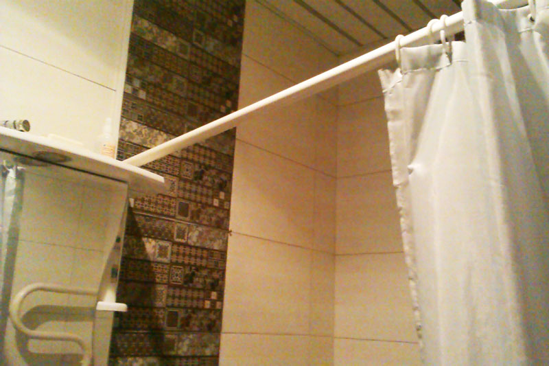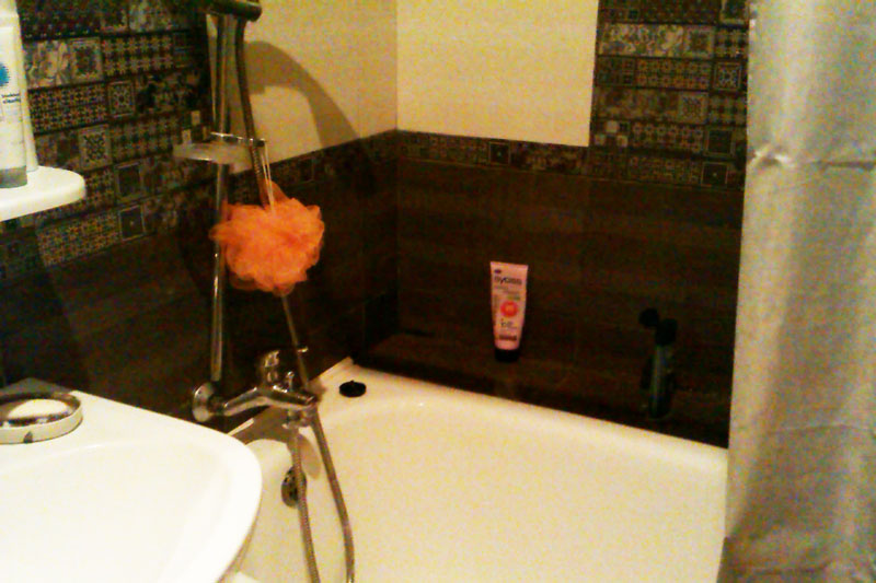 Ванная вот такая олдскульная, с занавесочкой. Штанга от занавески отвалилась и лежит одним концом на шкафчике. Имеется баночка хлоргексидина. Гели и шампуни - в достатке.
