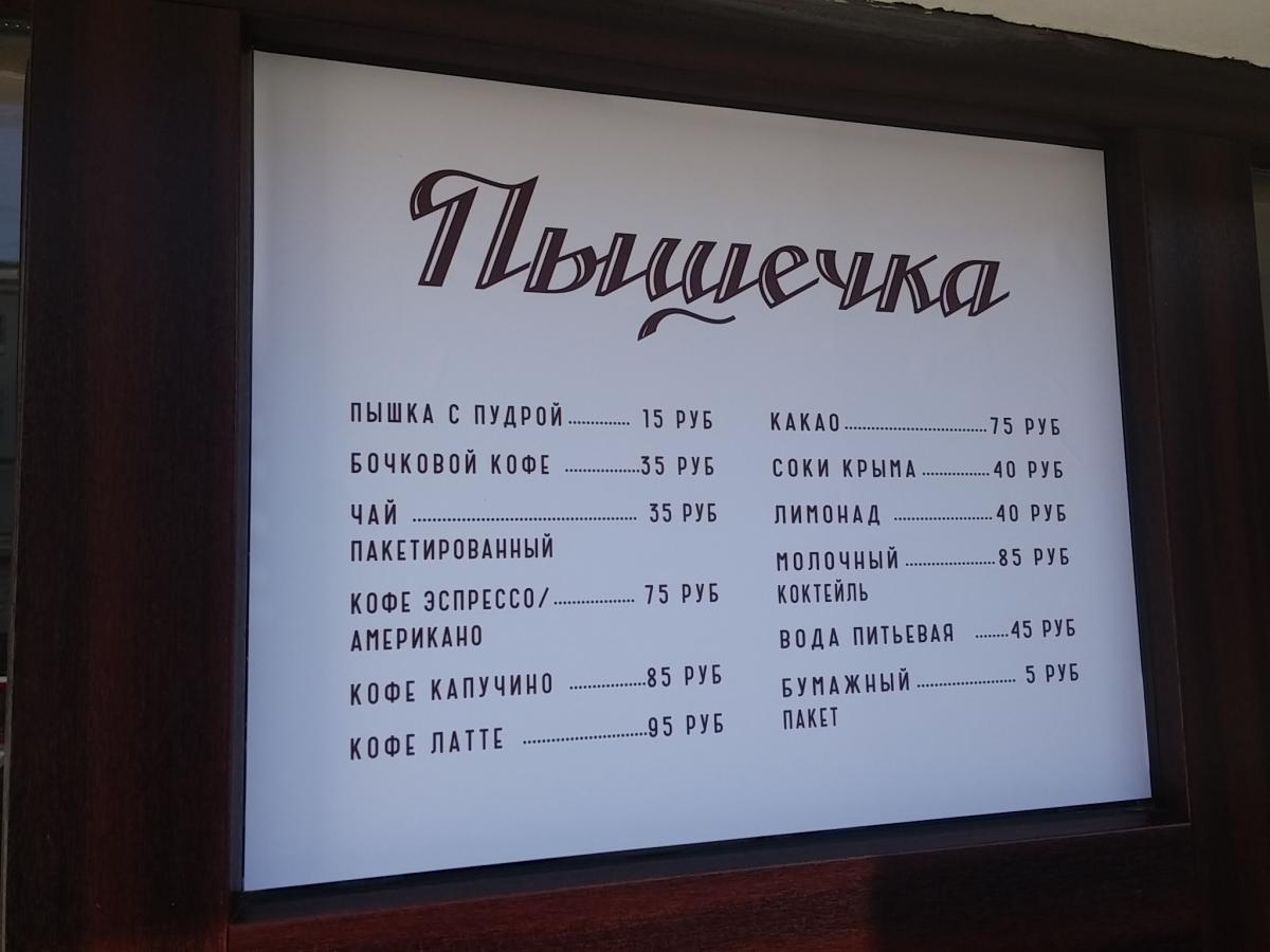 Идеология - имитация советской пышечной. Основные блюда - пышки по 15 рублей и бочковой кофе (сразу со сгущенкой) по 35. Есть, кажется, больше нечего, а из напитков еще присутствуют кофе из эспрессо-автомата, соки, лимонад и чай.
