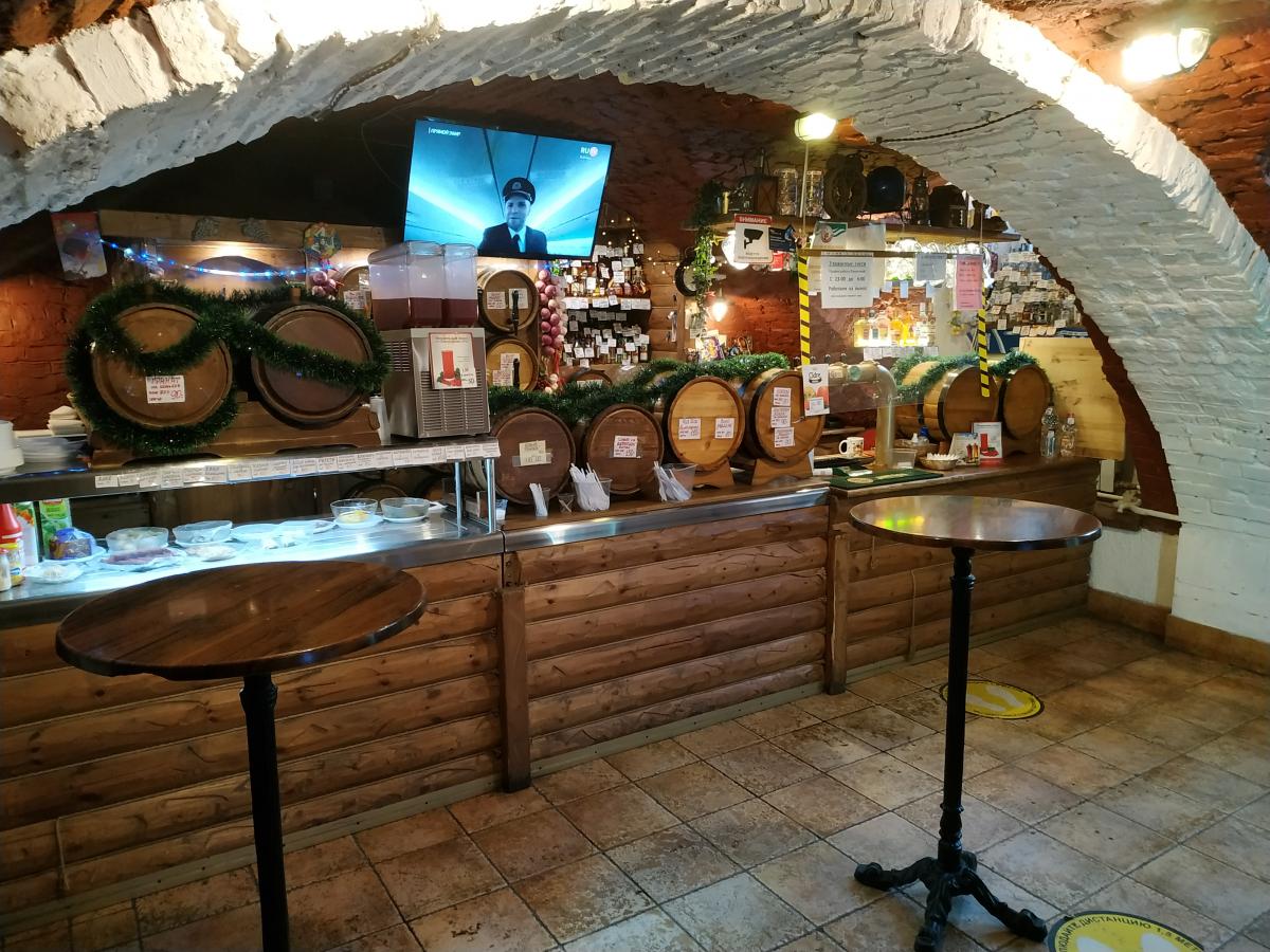 Интерьер более всего напоминает английский паб. Тяжелые столы, разгороженные барьерами, темное дерево. Возможно, раньше там было нечто подобное. Теперь же - скорее рюмочная с соответствующим ценником.