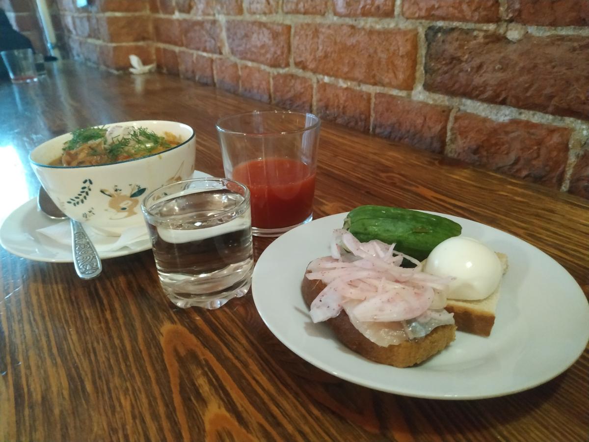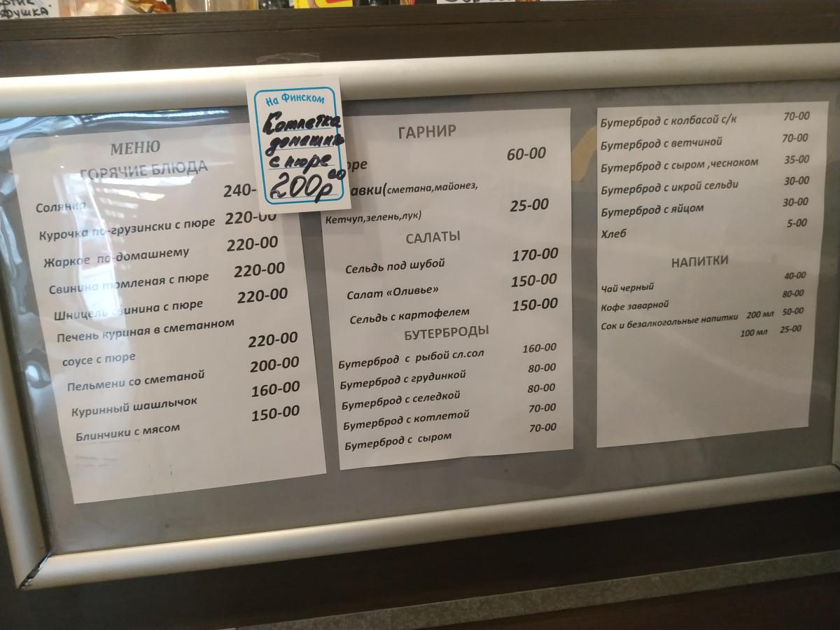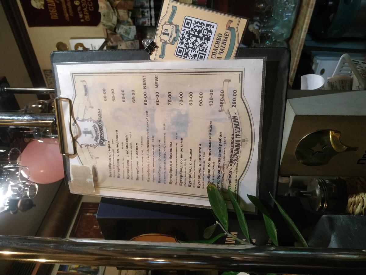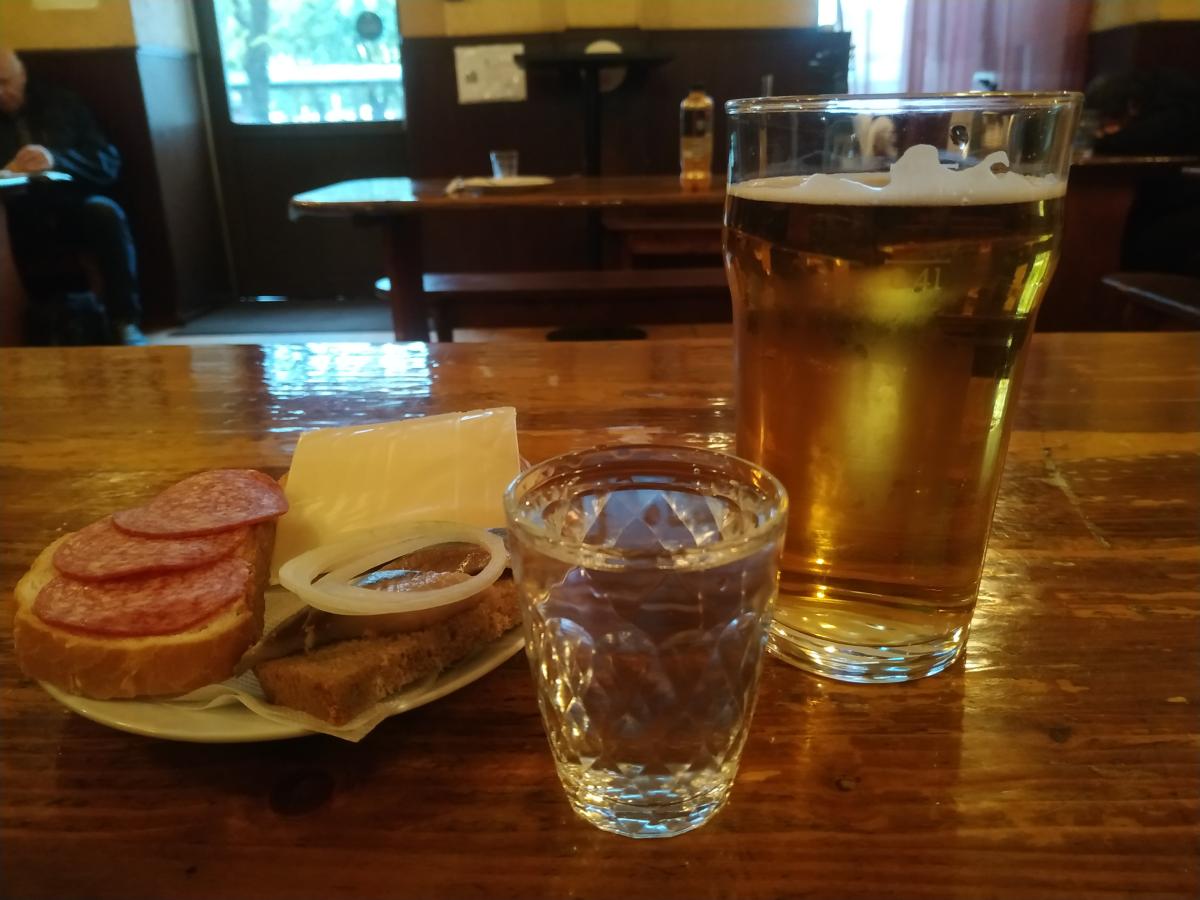 Пиво Жигулёвское (0.5/170р) не советую, ссанина. На эти деньги лучше ещё соточку взять, с соком или бутербродом. Бутербродов много разных, самые нормальные с селёдкой и луком (55р), с колбасой или сыром уже по 60р. С форшмаком тоже за 60р, и можно соблазниться, но он половинчатый, тут надо внимательнее смотреть меню. Из горячего (яичница, жареные пельмени, супы, колбаски, котлета) - ничего не брал. Но оно есть, приносят на стол сами.