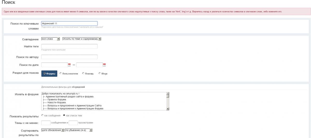 "Одно или все введенные вами ключевые слова для поиска имеет менее 4 символов, или же вы ввели в качестве ключевого слова недопустимые к поиску слова, такие как 'html', 'img' и т.д. Вернитесь назад и увеличьте количество символов в ключевом слове, либо измените его".